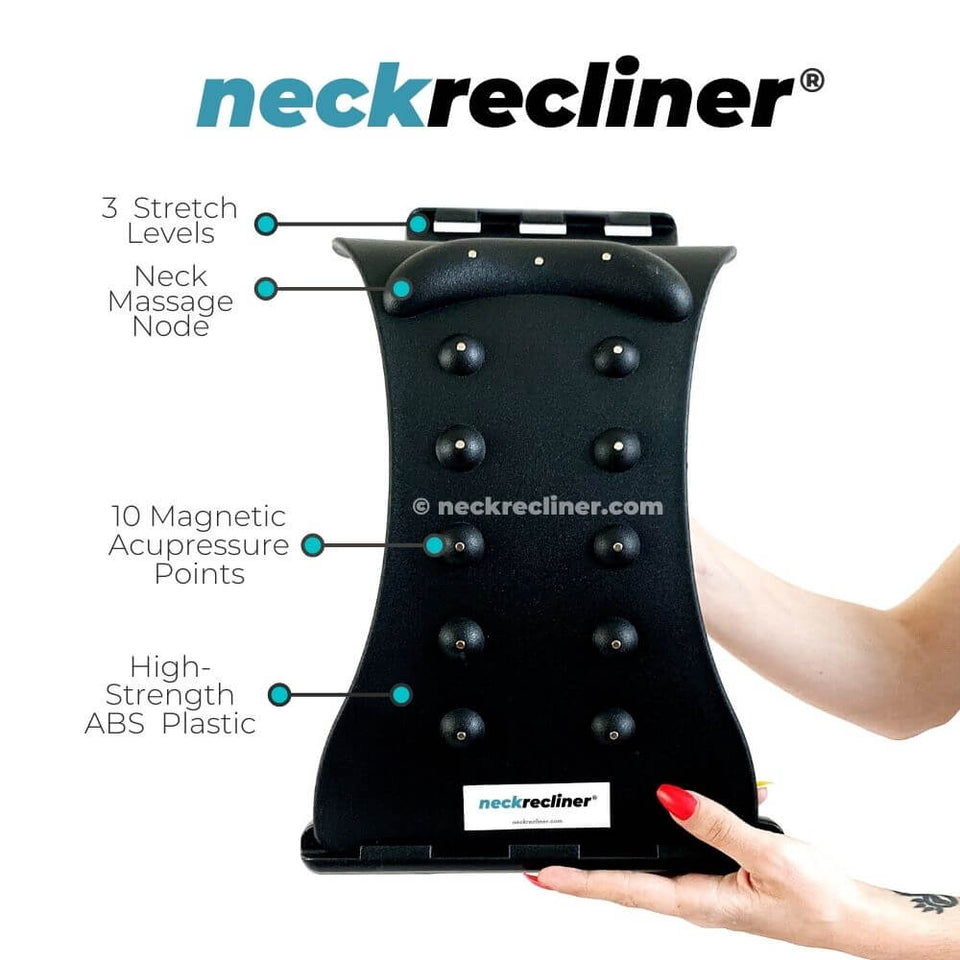 NeckRecliner® Cervical and Thoracic Stretcher is a small lightweight multi-level neck and thoracic traction device that helps your neck recline and relax immediately, and quickly relieve neck, shoulder and upper back pain due to tight muscles, excessive flexion, and poor spinal alignment.